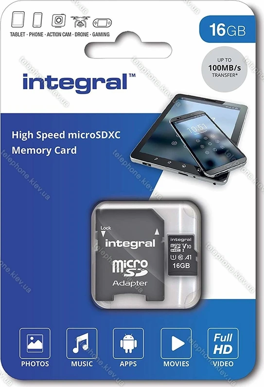 Карта памяти Integral High Speed R100 microSDHC 16GB Kit, UHS-I U1, A1, Class 10 купить недорого в Украине: гарантия качества и оптовые цены