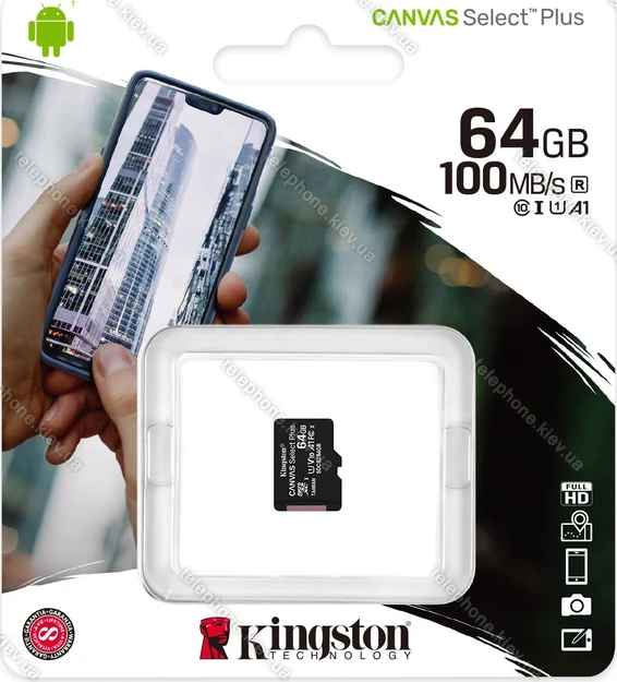 Карта памяти Kingston Canvas Select Plus R100 microSDXC 64GB, UHS-I U1, A1, Class 10, Украина |