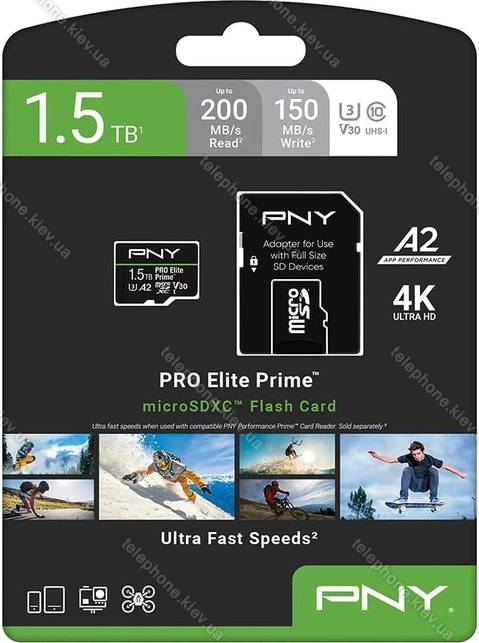 Карта памяти PNY Pro Elite Prime R200/W150 microSDXC 1.5TB Kit, UHS-I U3, A2, Class 10, Украина |