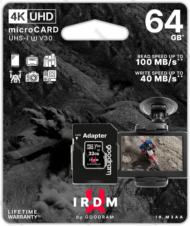 Карта памяти goodram M3AA IRDM MICROCARD R100/W40 microSDXC 64GB Kit, UHS-I U3, Class 10, Украина |